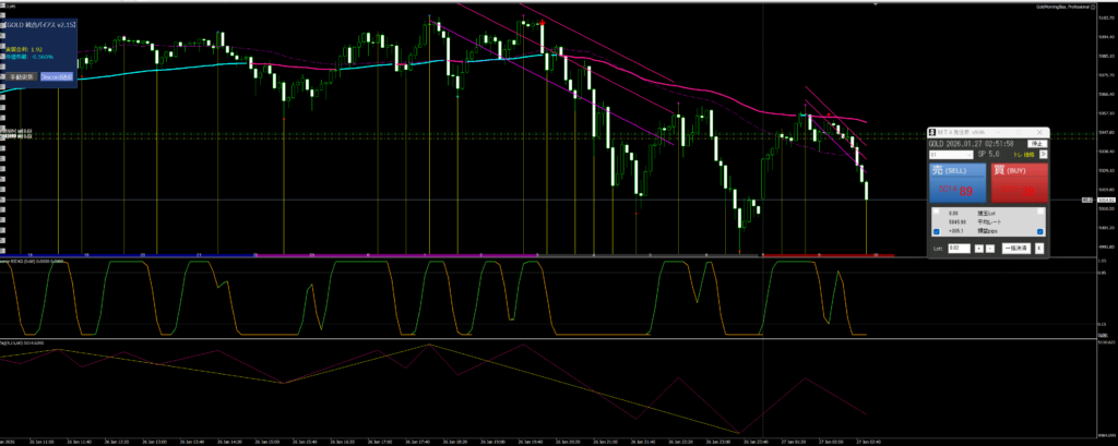 2026年1月27日のゴールド(GOLD)相場は、歴史的な高値圏から一転、鋭い下落を見せました。本記事では、+305.1 pipsという驚異的な利益を確定させたショートエントリーの根拠と、その背景にある環境認識を詳しく解説します。なぜ、あの局面で「売り」を仕掛けることができたのか。その論理的背景を紐解きます。