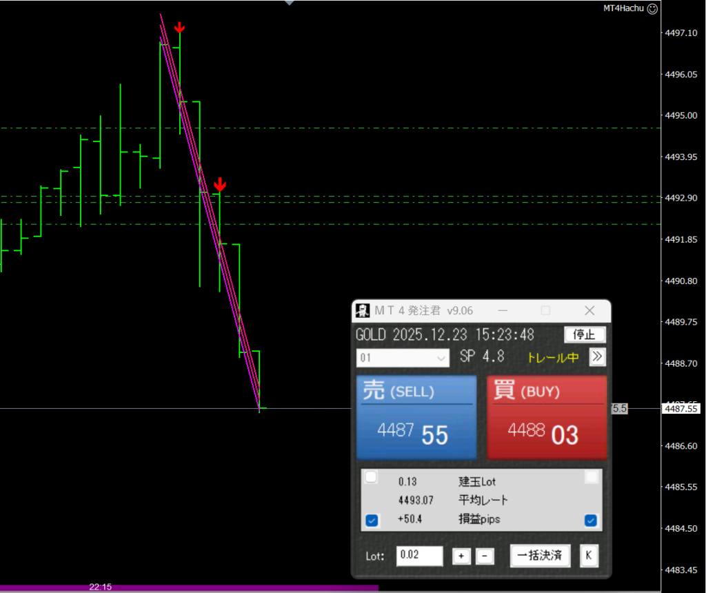 このレジスタンス付近で価格の上昇が止められ、再び下落に転じようとする動きを確認した上で、平均レート「4493.07」付近でエントリーを実行しました。チャート上の赤い下向き矢印は、これらのエントリーポイントを示唆しています。